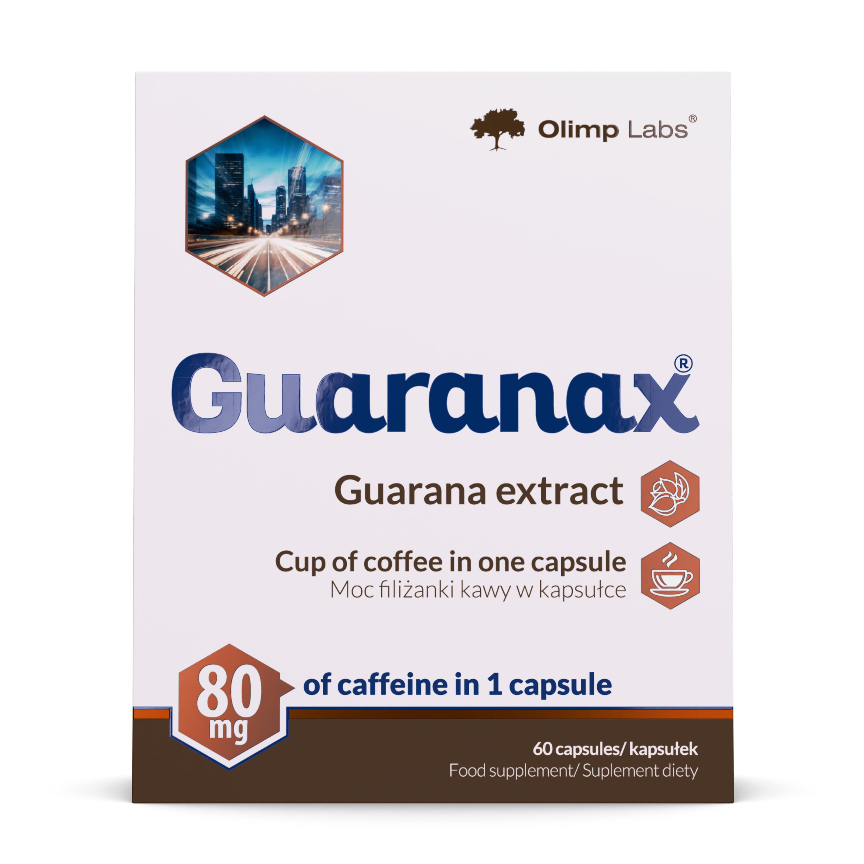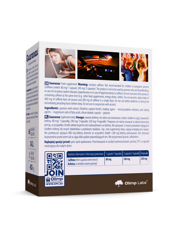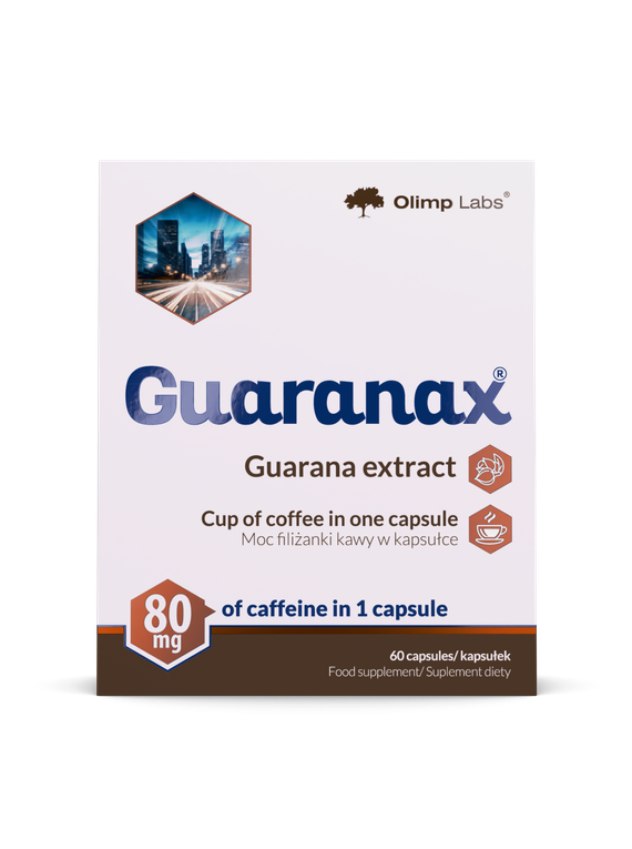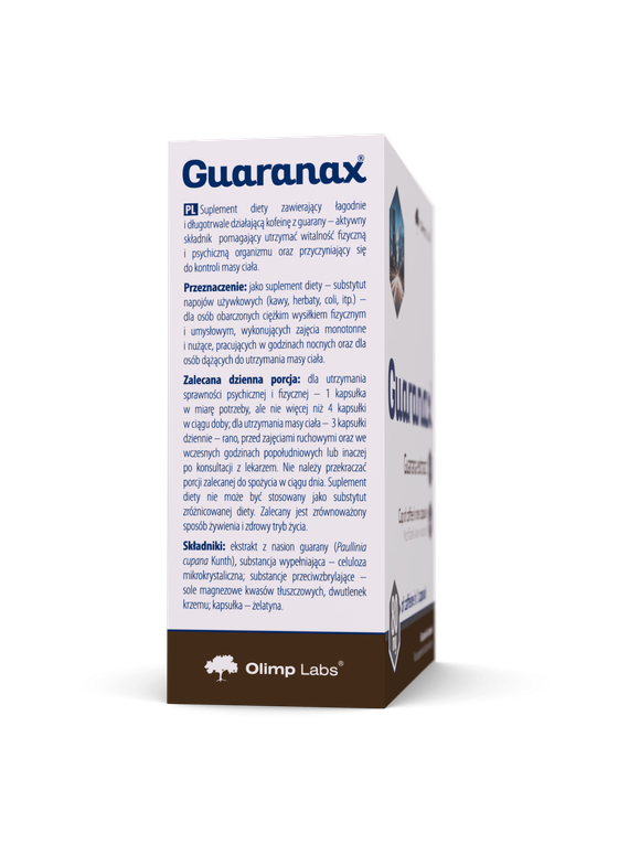 Olimp Guaranax – food supplement in capsules. The product contains caffeine from guarana extract which contributes to maintain physical and psychological vitality as well as to control body mass.