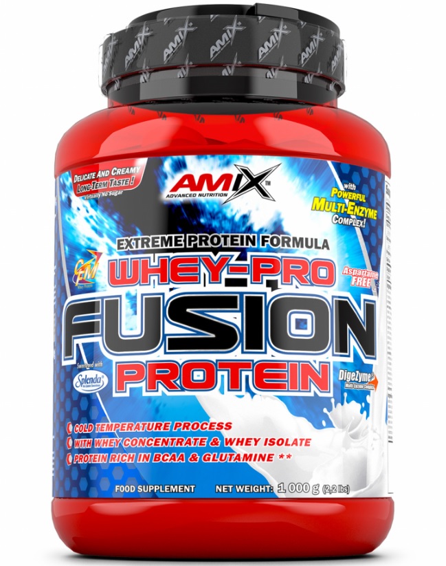 Ingredients: Whey-Pro Fusion 1:1 Protein Complex 80% (ultrafiltered low temperature processed instantized whey protein concentrate /from milk/, CFM® - Cross-flow Microfiltered whey protein isolate /from milk/ with protein fractions [beta-lactoglobulin, alfa-lactoglobulin, serum albumin, immunoglobulin, glycomacropeptide, lactoferrin and lactoperoxidase]); stabilizer: collagen hydrolyzate; maltodextrine, cocoa powder (only in flavours: chocolate, choco-coconut, peanut-choco-caramel, moca-choco-coffee), acidifying agent: citric acid (only in blue raspberry, mango-pineapple, pinacolada and lime-yogurt flavours); emulsifier: soya lecithin; aroma, stabilizer: sodium carboxy-methylcellulose; sweeteners: sucralose Splenda® and acesulfame-K; dye: (banana flavour - curcumin; pina colada - curcumin; pistachios flavour, melon-yogurt flavour and apple&cinnamon flavour: copper complexes of chlorophyll; blue raspberry flavour - fruit extract /anthocyanin/, brilliant blue FCF; mango- -pineapple flavour and lime-yogurt flavour - beta-carotene); beetroot juice (only in strawberry, forest fruits and pina colada flavours), patented digestive enzyme DigeZyme® - multi-enzyme complex (amylase, lipase, lactase, cellulase and bacterial neutral protease), cocoa powder (only in flavours: cookies cream and double white chocolate), salt.