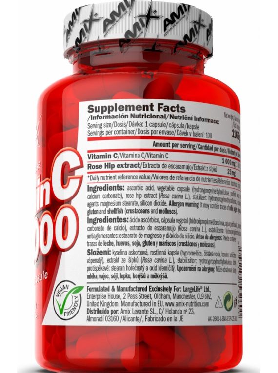 Ingredients: ascorbic acid, vegetable capsule (hydroxypropylmethylcellulose, purified water, dye: calcium carbonate), rose hip extract, stabilizer: hydroxypropylmethylcellulose Methocel®, anticaking agents: magnesium stearate, silicon dioxide.