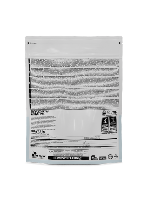 Rocky Athletes Creatine Other Ingredients: 97% micronized creatine monohydrate, 2,7% magnesium oxide, 0,007% pyridoxine hydrochloride – vitamin B6, acidity regulator - citric acid; flavourings; sweeteners - acesulfame K, sucralose.